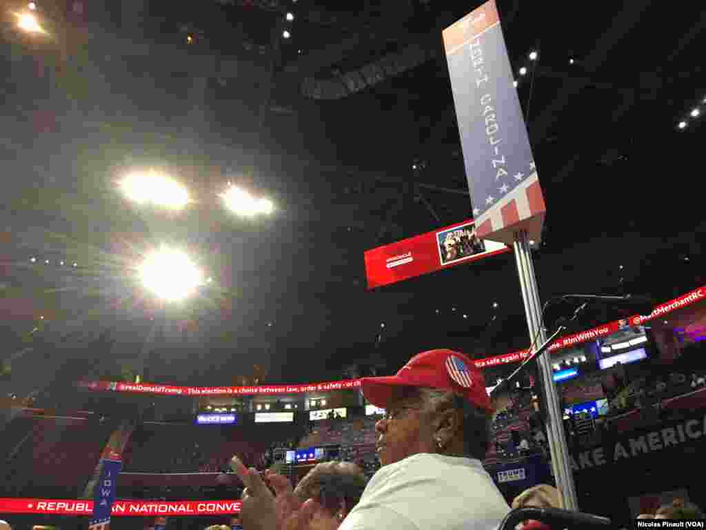 Les participants se lèvent à l’exécution de l’hymne national américain à l'ouverture de la convention nationale des républicains à Cleveland, Ohio, le 18 juillet 2016. (VOA/Nicolas Pinault)